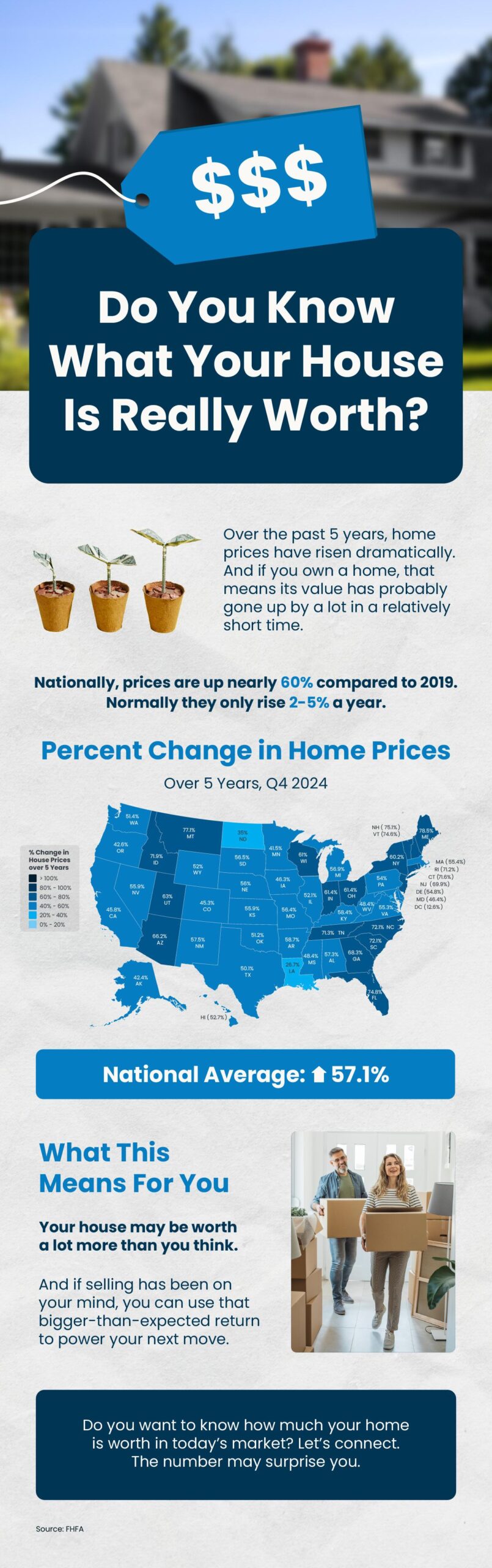 - Nationally, prices are up nearly 60% since 2019. And, if selling has been on your mind, you can use that bigger-than-expected return to power your next move.