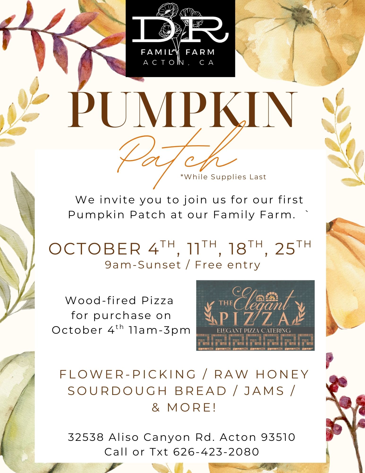 Debellis Ranch 9am – Sunset, Free entry! Your invited to the first pumpkin patch at the Debellis Family Farm. Wood-fired Pizza for purchase on 10.04 11am-3pm, flower-picking, raw honey, sourdough bread, jams & more! Learn More