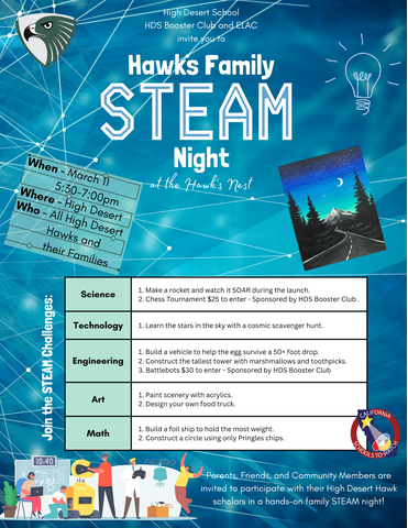 High Desert School 5:30pm – 7:30pm, Parents, friends, and community members are invited to participate with the High Desert Hawk scholars in a hands-on STEAM night! Learn More