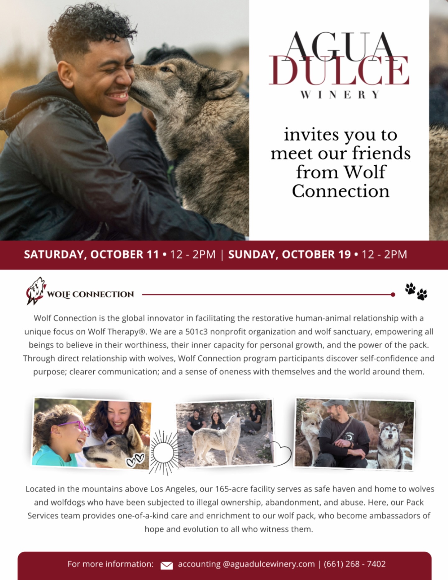 Agua Dulce Winery 12-2pm, Come experience the magic of Wolf Therapy®, learn about their sanctuary, and connect with these incredible animals. Wolf Connection is a global innovator in facilitating the restorative human-animal relationship with a unique focus on Wolf Therapy.