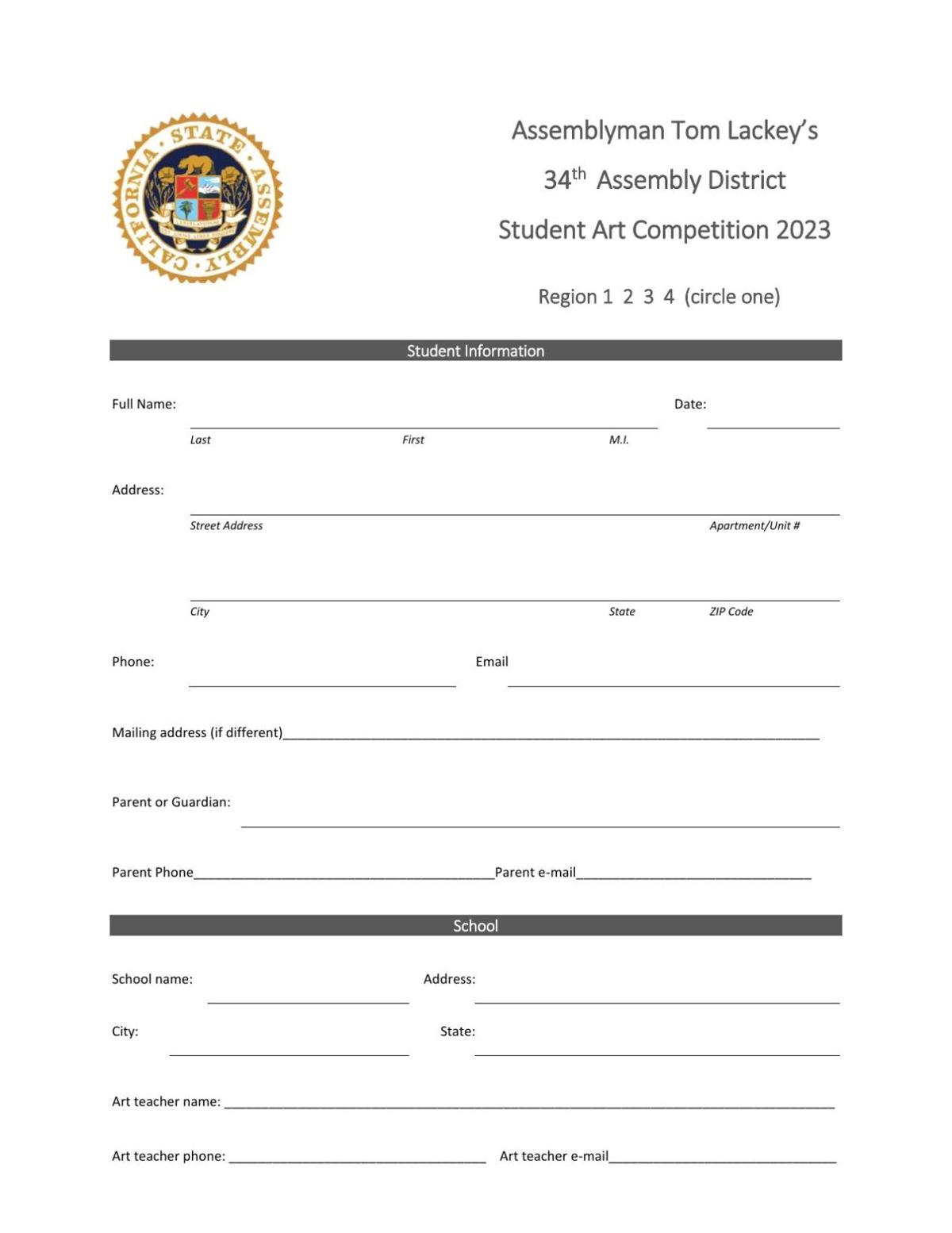 Assemblyman Tom Lackey invites students to participate in the 34th Assembly District Student Art Competition. This competition is open to all California public, private or home-schooled students tat reside in the 34th Assembly District. Students from K through 12th grade and special Education students are eligible to enter. The theme this year is “California of the Future” and it can be depicted as a landscape, portrait or still life. Deadline to enter if Dec. 12th at 5pm. Attached please find the flyer, application and rules. Questions call 661-267-7636 Learn More Application