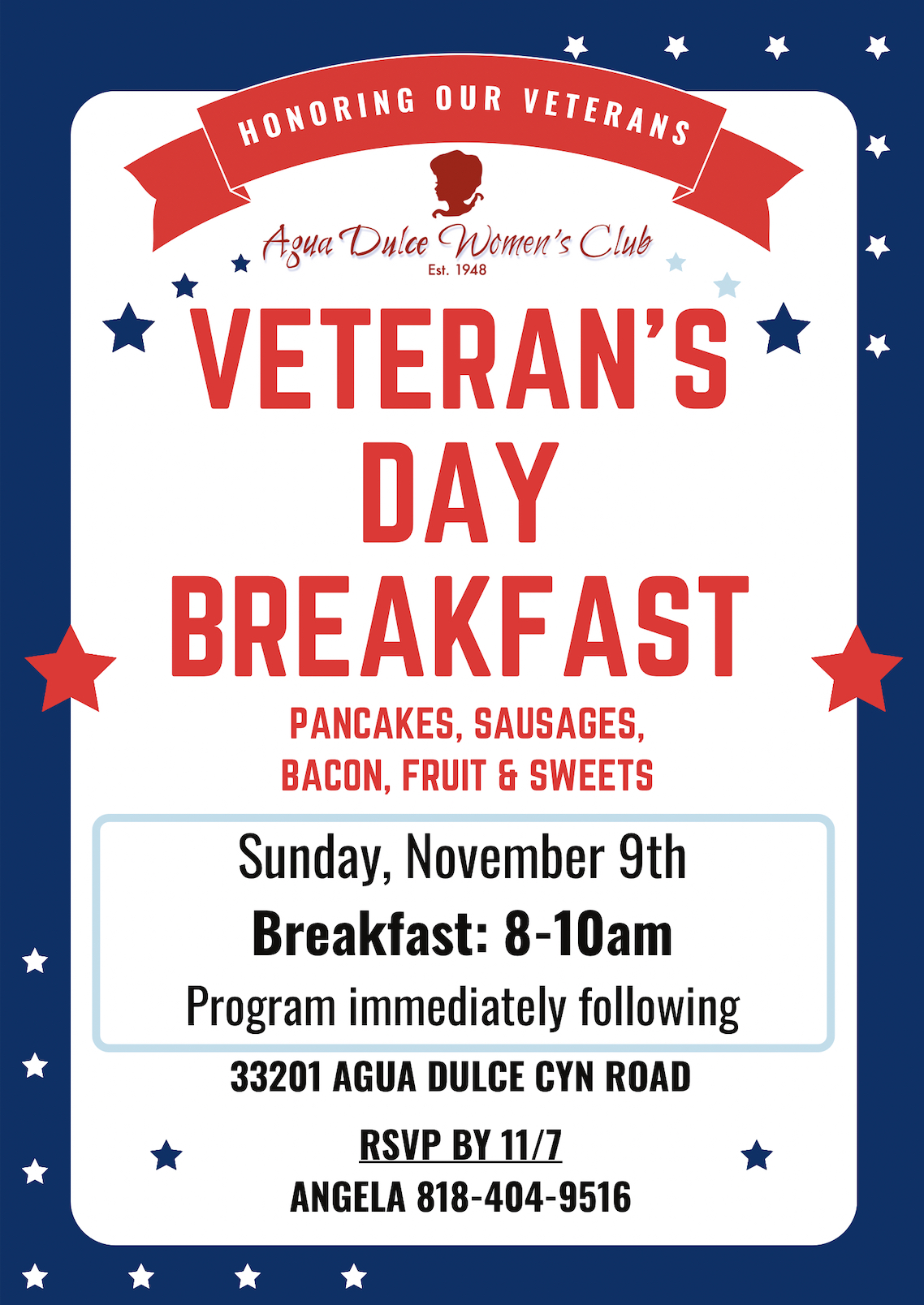 Agua Dulce Women’s Club, Honoring our Veterans 8-10am, Pancakes, Sausages, Bacon, Fruit & Sweets. Program immediately following. RSVP by 11/07 818-404-9516 Learn More