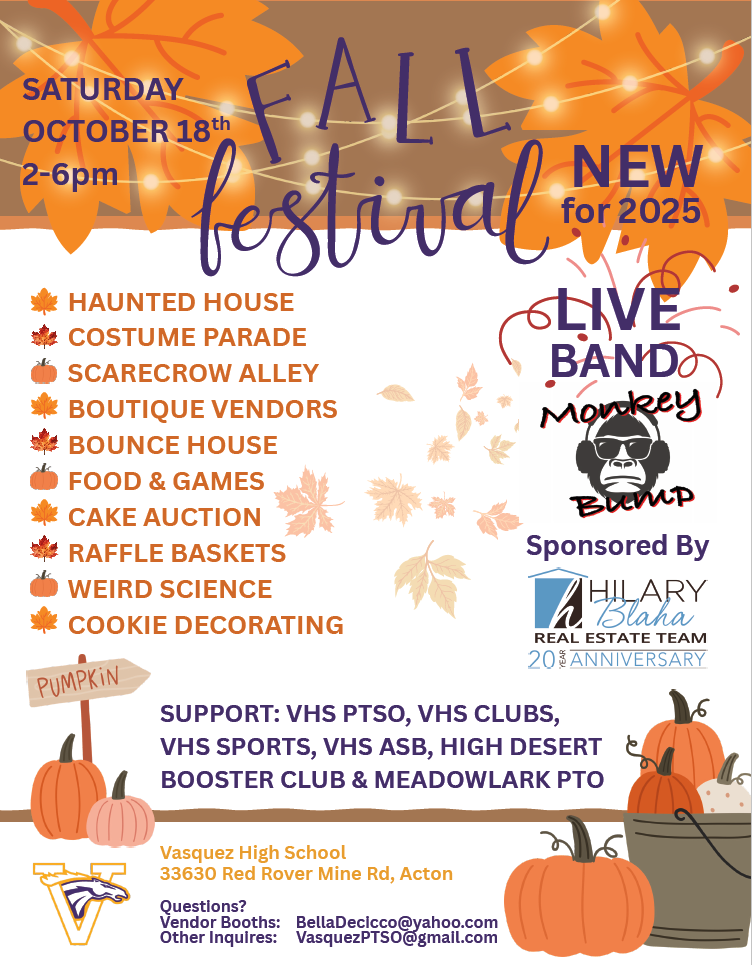 VHS 2-6pm. New for 2025 LIVE BAND: Monkey Bump Sponsored by Hilary Blaha Real Estate Team. Haunted house, costume parade, scarecrow ally, boutique vendors, bounce house, food, games, cake auction, cookie decorating, weird science, raffle baskets, live music & more! Support VHS PTSO, VHS Clubs, VHS Sports, VHS ASB, High Desert Booster Club & Meadowlark PTO. View Flyer