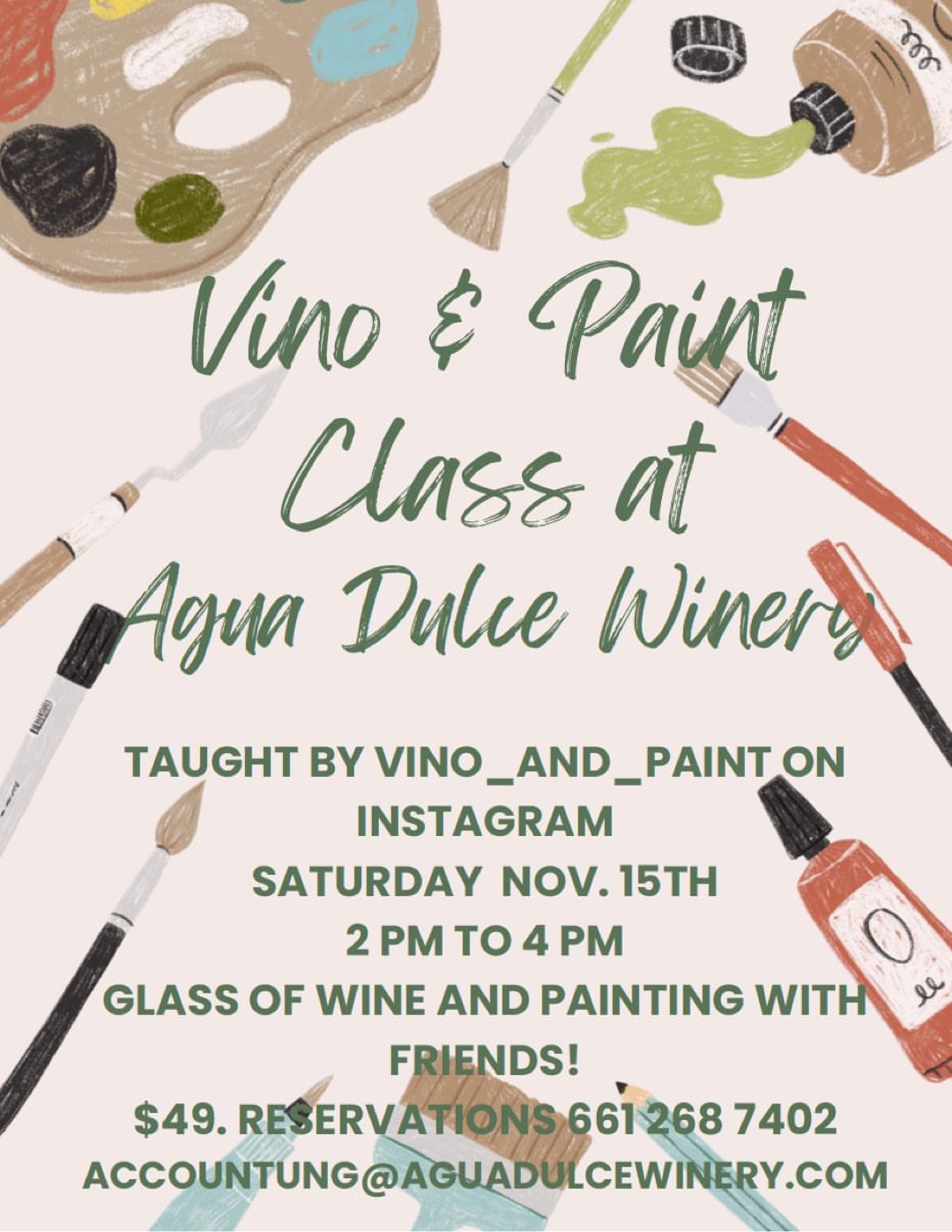 Agua Dulce Winery 2pm – 4pm, Glass of wine and painting with friends! Taught by Vino_and_Paint on Instagram, Reservations 661-268-7402, Accounting@AguaDulceWinery.com Learn More