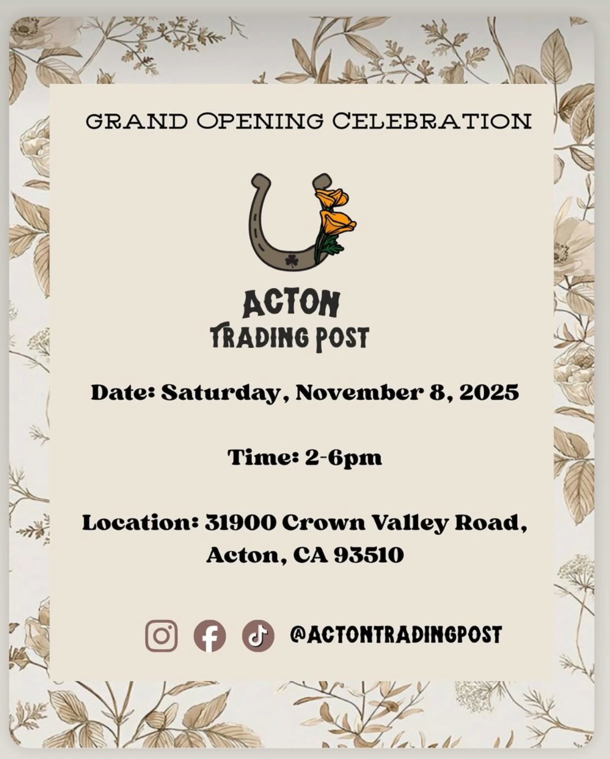 Acton Trading Post 31900 Crown Valley Road, Acton, CA, United States31900 Crown Valley Road, Acton 2-6pm, An afternoon of ribbon cutting, exclusive discounts, raffles, photo-op, DIY “make & take” fun and sweet treats. Western-inspired boutique - home décor, apparel, handmade […]