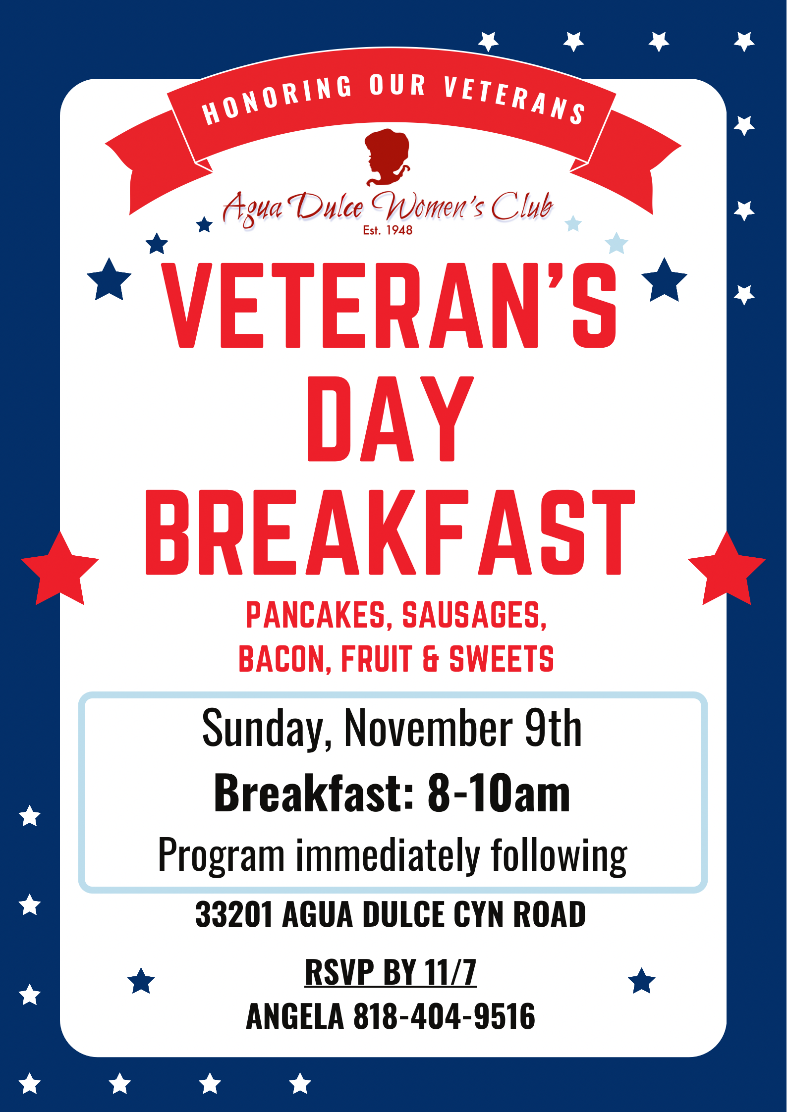 Agua Dulce Women's Club 33201 Agua Dulce Canyon Road, Agua Dulce, CA, United StatesAgua Dulce Women’s Club, Honoring our Veterans 8-10am, Pancakes, Sausages, Bacon, Fruit & Sweets. Program immediately following. RSVP by 11/07 818-404-9516 Learn More