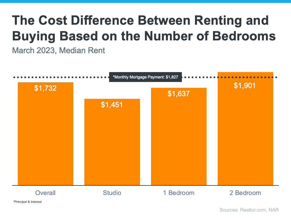 The graph below uses national data on the median rental payment from Realtor.com and median mortgage payment from the National Association of Realtors (NAR) to compare the two options. As the graph shows, depending on how much space you need, it’s typically more affordable to own than to rent if you need two or more bedrooms: